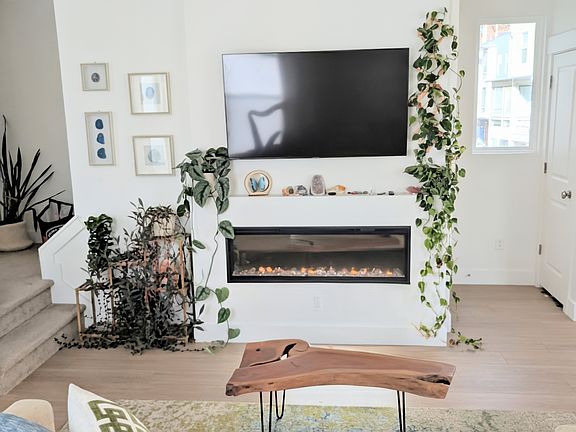 Modern Interiors: Open-concept 2nd floor featuring an electric fireplace, upgraded designer dining chandelier, and sleek island pendant lighting.