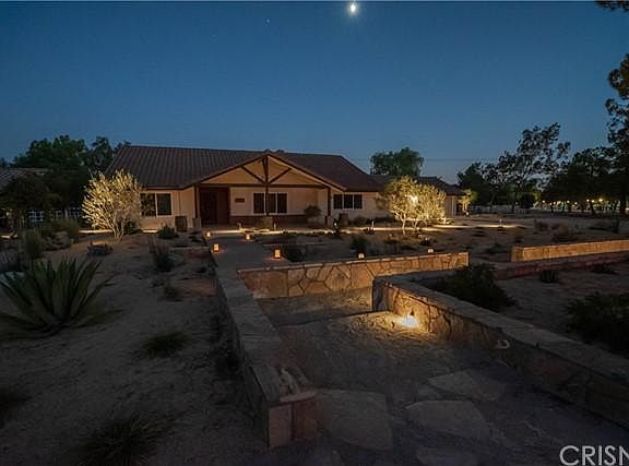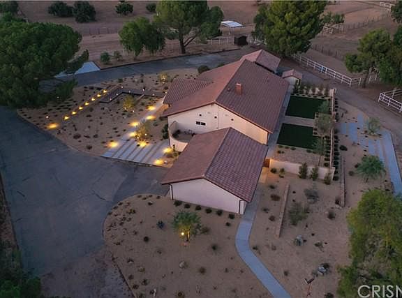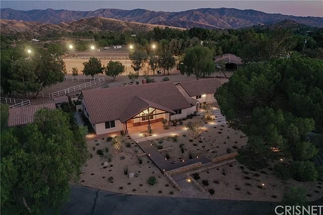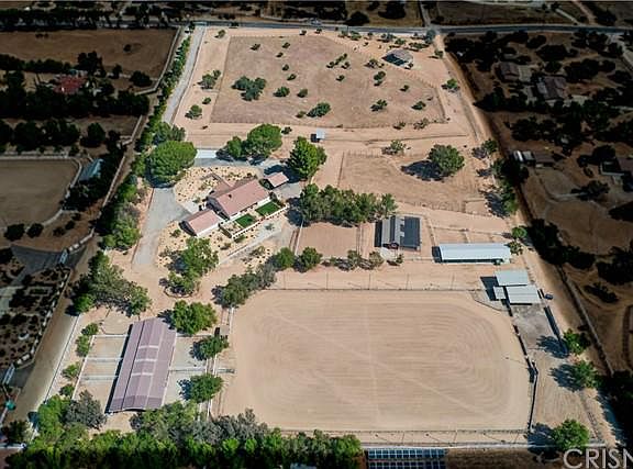 Welcome to Darling Ranch, an amazing equestrian property in the heart of Agua Dulce, Southern California's best kept secret. Darling Ranch consists of 2 separate 5 acre parcels for a total of 10 acres of extensive horse facilities, with a rare center of town location on paved road and with natural gas. There's a huge lighted and watered arena complete with roping chute and livestock pens. Three separate barns with their own corrals include: one 5 stall breezeway barn with tongue and groove faced doors, tack and hay rooms, one 2 stall shed row barn with tack and hay rooms, and another 3 stall barn with hay/tack room and fully contained pens, currently being used as a chicken/small animal coop. Other amenities include a perfect pasture,numerous shaders, and multiple smaller turnout arenas and grazing pastures-all cross fenced and fully gated. The single story home's interiorhas just gone thru a major transformation remodel and update from the drywall infeaturingnew plumbing, new electrical, fresh skip trowel drywall over new insulation,Saltillo tile floors thru-out, and ceiling mountedspeakers.The all new kitchen is open to the great room and hasplatinum leather granite counters over American walnut cabinets, copper farmhouse sink,and new stainless appliances. The large open great room has wood beam ceilings, a Ventian plaster fireplace,new french doors, and is open to the game room.The flexible floorplan has 2 bedrooms plus an office and a remodeled split master bathroom and is designed for future expansion. It featuresdouble sinks and toilets, a separate tub & shower with all new fixtures. Other recent improvements include roof replacement, new exterior stucco, HVAC replacement, and wood cased windows thru-out,There's a covered patio leading to the enclosed back yard with access to the courtyard anda detached 2 car garagew/ workshop. Both yardsfeaturemeticulously maintained hardscaping,low usage landscaping and exterior lighting everywhere..Truly an amazing one of a kind horse property.