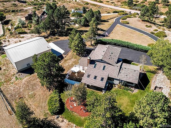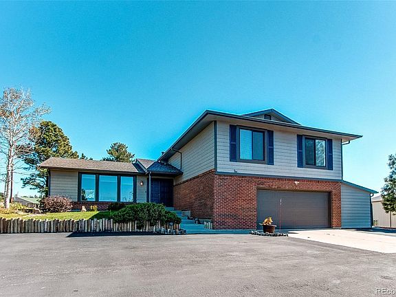 Beautiful upgraded tri-level home in a prime location on a gorgeous 2.38 acre site with fabulous Front Range mountain views! Situated in the tranquil rural Pine Valley community & nestled among majestic pines on a quiet interior road. This lovely home is conveniently located only 5 min. to downtown Parker & backs up to a bridle/walking path. Offering 4 beds, 3 upgraded baths, finished basement, attached oversized 2 car garage & an exceptional 2,250 Sq Ft RV Out-Building. Welcome home to a spacious living room with large windows framing amazing mountain views. There’s an adjacent dining room & a vaulted family room that has abundant natural light featuring a dramatic gas fireplace with a large hearth, wet bar & a glass slider leads to a large covered patio; perfect for relaxing & those summertime BBQ’s. Upgraded kitchen is a delight boasting slab granite counters, SS appliances, greenhouse window & a sunny breakfast nook. Upstairs you’ll find the primary bedroom providing wonderful vistas of the rural countryside & the mountains. Upgraded 4-piece primary bath has a frameless shower, granite vanity w double sinks, tile flooring, & a walk-in closet. 2 more upper level beds share an upgraded full bath. 4th bed is on the lower level along with a ¾ bath & laundry/mud room with cabinetry. You’ll find additional living space in the basement’s spacious rec/game room, plus there’s a bonus room, storage room & a crawl space for more storage. Other amenities include A/C, radon mitigation, sky lights, fully fenced yard, storage shed, owned propane tank. Gated circular paved driveway for lots of off-street parking. Outbuilding boasts a 16' ceiling, concrete floor, floor drain, wall mounted heating, 2-50-amp RV hookups, separate 220V outlet, workshop, lighting. Overhead crane & Elfa shelving in garage. No HOA fees or covenants. ER zoning allows for horses & other livestock. Right around the corner from shopping, dining & entertainment. Easy access to C-470. See virtual 3-D tour.
