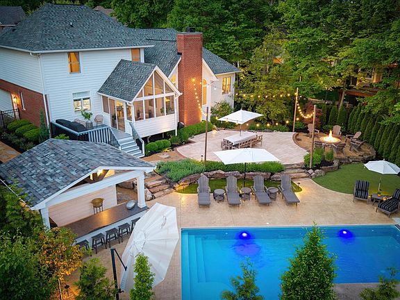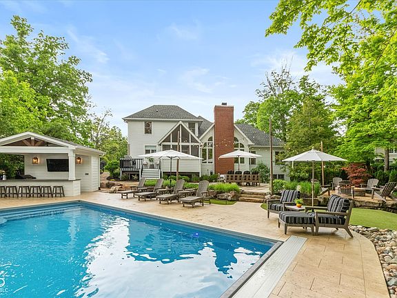 Custom heated pool (2023) with dual waterfalls, outdoor kitchen with barstool seating, travertine patio, gas firepit, screened porch, flagstone steppers, landscape lighting, irrigation system, Astroturf in back, fully fenced and thoughtfully landscaped with privacy-focused tree plantings for a secluded outdoor retreat, and completely updated throughout the interior! Over $500,000 in upgrades and improvements in the last 6 years! This custom Mark Stout built home in highly coveted Admirals Sound is a true entertainer's dream. Inside, the stunning great room features soaring ceilings, a wall of windows, and a statement fireplace, flowing into the eat-in chef's kitchen with quartzite countertops, high-end appliances, and a center island perfect for entertaining. The main-level master suite offers a completely renovated bathroom, including a glass-enclosed marble shower, soaking tub, dual sinks and customized walk-in closet. The main level also offers a stunning formal dining room with wainscoting and grasscloth wallpaper, as well as a private home office with beautiful marble flooring and built-ins. The fully finished basement includes a wet bar, custom cabinetry with a Murphy bed, a dedicated home gym complete with mirrored walls and commercial-grade flooring, and egress windows, creating an ideal guest retreat. Upstairs are three additional bedrooms, an updated full bath with a dual vanity and the versatile bonus room, already plumbed for a 4th full bath and offers the potential for a 5th bedroom. See the updates list for more!