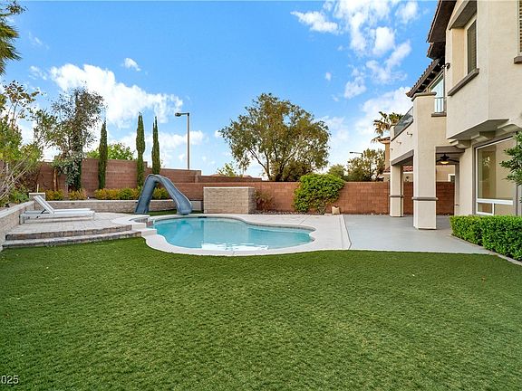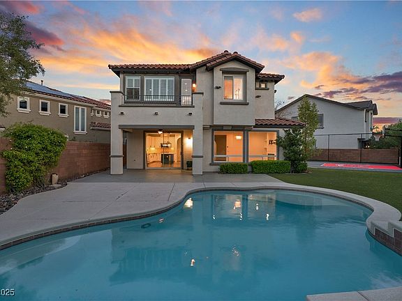 Beautifully updated 5-bed, 3-bath two-story Summerlin home on a large corner lot! This home features a 2-car garage, upgraded bathrooms, tile accents, built-ins, and laminate wood flooring downstairs. The kitchen has modern cabinets, sleek counters, and opens to a spacious living room with a fireplace and built-ins. Downstairs bedroom & bathroom is great for guests or a home office. Upstairs, there’s a spacious loft and a primary suite with a stunning updated bathroom, complete with a free-standing tub and walk-in shower. The backyard is perfect for relaxing or entertaining, with mature trees, lush landscaping, a pool, and a basketball court. Located near a community park and just minutes from Downtown Summerlin—this home has it all!