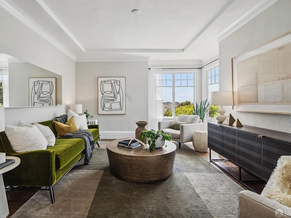 Come home to this 1920's vintage top floor corner condo with an iconic view of the Golden Gate Bridge & a perfect North side location in the middle of three upscale shopping districts. This elegant light-filled flat offers two bedrooms and one bath on the top floor of a two-story boutique property. Large scale rooms, all with serene outlooks include formal living and dining, eat-in kitchen, updated bath & separate laundry room/pantry. This gracious upgraded home exudes San Francisco charm while offering modern amenities. Prime North side location, situated perfectly with close proximity to Union/Chestnut/Polk Street shopping & restaurants as well as outdoor activities at Marina Green, Crissy Field & Fort Mason. One car side by side parking, in-unit washer/dryer & deeded storage included.