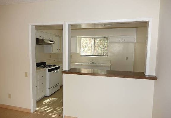Newer stoveLarge kitchenPlenty of storage cabinetsLaminate flooring