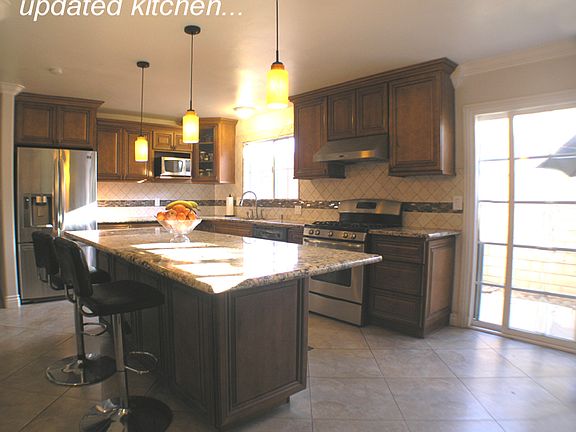 Located on a quiet cul de sac in a highly desirable Brea neighborhood & school district, this spacious home of approx. 2,000 SF has recently undergone a tasteful renovation. Home boasts 5 bedrooms and 3 baths; 2 of which are ensuite; 2 master suites with plenty of closet space. Huge, open kitchen has been entirely redone with quality cabinets, granite counter tops & functional island. Formal dining room has lots of built in cabinets and wine bar. All 3 baths have been tastefully updated. Upgrades include newer designer hard wood laminate & tile flooring thru-out, wide crown moldings, newer paint inside & out, newer kitchen appliances, water heater and A/C, dual pane windows thru-out, copper plumbing, jetted tub & more. Private landscaped backyard provides endless possibilities for entertaining & relaxation.