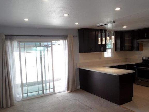 Single story; 3BR; 2BA home with 2 car garage and opener. Interior of home has fresh paint; smooth ceilings; central A/C; and carpet throughout. Spacious living room with gas fireplace. Kitchen with gas cooking and stainless steel appliances; quartz counter top with lots of space; ceramic tile floors; dark wood cabinets; microwave oven; deep sink; dishwasher; breakfast bar; and eating area. Slider door off kitchen leads to backyard. Master bedroom with attached bathroom with dual sink vanity and tiled shower/ tub combo. Hall bathroom with vanity and shower/ tub combo. Washer and dryer hook-ups in garage. Backyard features two good size side yards with lemon and lime trees. Great Brea schools. Gardener included in rent. Rent- $2695 Deposit- $3000 Pets: Submit Avail: NOW