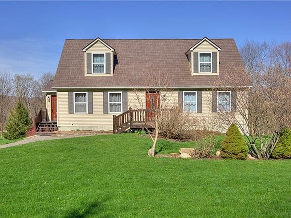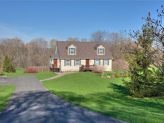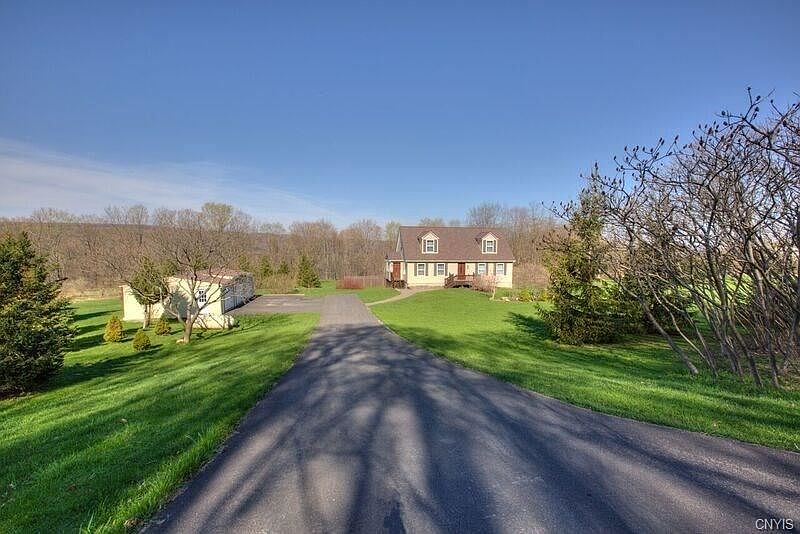 Quality, custom built, transitional, Cape Cod on 15.48 acres. Views of Otisco Lake. Home is 1 mile from Vesper hills Golf Course. Incredible find on a dead end road. 3 car, detached garage, plus two 20X12 outbuildings. One is insulated & heated, perfect for children, crafts, or pets. Vinyl, privacy, fully fenced backyard area. Livingroom with hardwoods, eat in kitchen with oversized, eating area, first floor laundry. Two bedrooms on first floor, one is master sized, full bath. upstairs has 2 bedrooms, 2nd master, full bath with jacuzzi. Fabulous views !! Lower, walkout has 9 ft ceilings, family room with pellet stove to keep your utilities low. 22Kw Generator with automatic transfer panel. 50 year, steel shingle roof. Move in ready !! Come See ! Only 34 minutes to downtown Syracuse