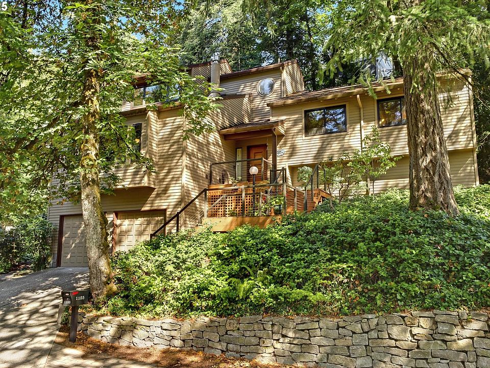 John Storrs inspired NW Contemporary in the heart of the West Hills, perfectly situated between the Hillsdale shopping area and Farmer's Market, OHSU and the SW Trails. Filled with warm wood accents and soaring ceilings, and with walls of windows that bring the outside in, this home represents everything that the Pacific NW has to offer. The airy and open living and dining space is the heart of the home and has stunning vaulted ceilings, and sliding doors out to a sunny deck with forest views. Built to accommodate both elegant and casual entertaining, the kitchen features a Great Room, complete with vaulted ceilings, a wall of glass doors and a wood burning fireplace. The kitchen is a host's delight, with granite countertops, thoughtful storage, copious bamboo cabinets, double ovens, 5 burner cooktop and a breakfast bar. The primary suite features stunning South facing views of the forest with 2 walk-in closets, skylights and a special "port window" in the bath. There is a separate entrance to the guest suite, which features vintage knotty pine paneling in both the bedroom and bathroom. The two-car garage has plenty of space for vehicles and additional storage.