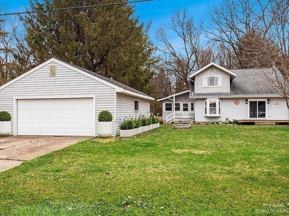 Lake privileges on Portage Lake! Welcome to this beautiful four-bedroom colonial that boasts picturesque views of Portage Lake. You'll enjoy the relaxing spaces this home offers, including a three-season sunroom and a back porch overlooking the wooded backyard. The open concept living room and dining room with a cathedral ceiling overlook the lake and feature a wood-burning stove highlighted by a lovely stone wall. The kitchen is updated and modern with custom cabinets, quartz countertops, stainless appliances, and a breakfast bar seating area. The convenient first floor primary bedroom features an adjacent remodeled full bathroom with a zero-entry ceramic tiled shower. Upstairs, you'll find three large bedrooms and an additional bathroom. The spacious first-floor laundry room offers plent plenty of storage space. This home also features a two and a half car garage with additional storage space and a large yard with a bonfire pit and deck. With over one half acre of land, you'll enjoy stunning views of the lake and woods. You'll also have lake privileges for ingress and egress on Portage Lake, conveniently located across the street. Enjoy kayaking, canoeing, or paddle boarding. Just in time for summer!