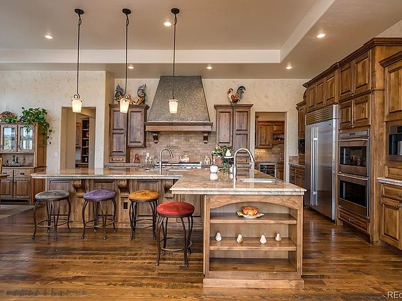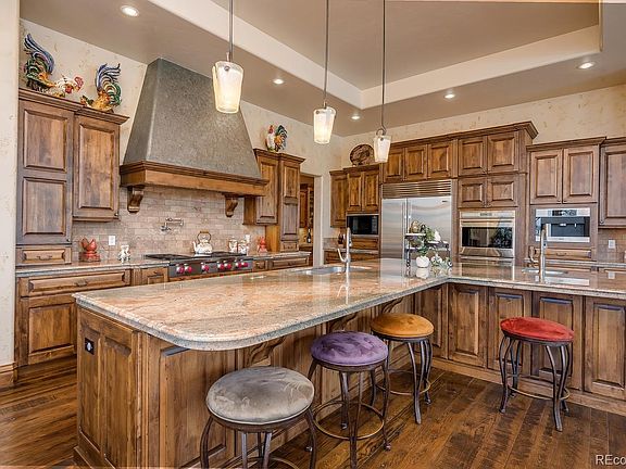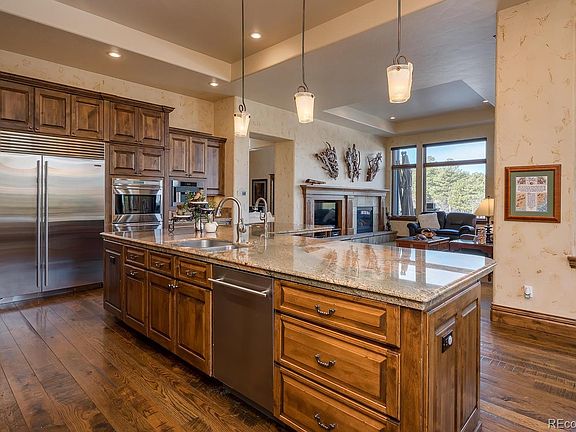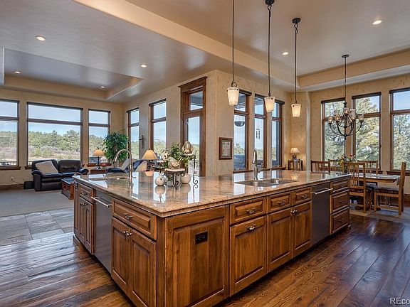 Exclusive gated community, award-winning Golf Club at Bear Dance! Mountainous terrain, mature ponderosa pines, oak-lined ridges stunning bluff and mountain views. Hiking/biking. Easy access to Colo Springs, Castle Rock, south Denver metro, schools, shopping, restaurants. NuWest custom home, end of quiet cul-de-sac, 2.7 acres, surrounded by open space! Big old fashioned wrap-around deck overlooks first fairway and green! Porte-cochere + breezeway connect 3 car att + 1 car det gar. Adjudicated water rights w/cumulative benefit! Dazzling home! Turret entry, cathedral ceilings, 9' doors, art niches, stunning wide plank hand-scraped alder wood floor, custom woodwork, large windows. Tuscan-inspired textured paint palette on hand trowel walls complements beautiful travertine, tile, slate and granite. Palatial great room w/ soaring wood-beamed ceilings + bookend fireplaces. Waterfall hanging inc in sophisticated dining room. Living room is adjacent to well-appointed chef's kitchen! 42' staggered alder cabinets, stainless Wolf + Sub Zero app, 2 dishwashers, double ovens, pot filler faucet, wine fridge, built-in Miele cappuccino maker. Sun-bathed breakfast nook, huge walk-in pantry, butler's bistro. Main level dreamy master w/new carpet, 2-sided stone fireplace, sitting room, coffee bar, his + hers closets w/laundry, jetted tub, over-sized steam shower. Upstairs=private en-suite guest quarters and stunning one of a kind library/office w/magnificent views from balcony. Smartly designed walkout basement has 2 bedrooms, recreation room, billiards room, nearly 500 bottle wine cellar and pub! Watch sports/movies in theatre room, wired rear projection. Dedicated exercise room with rubber gym flooring. 2nd laundry. Smart lights throughout, wired security, Thrive internet, 4 furnaces, 3 AC, two 50 gal water heaters, water softener, carbon filter, 2 storage rooms, newly paved/coated driveway, 2019 ext paint. Some furnishings negotiable, please inquire. Another "TESTA-monial!"
