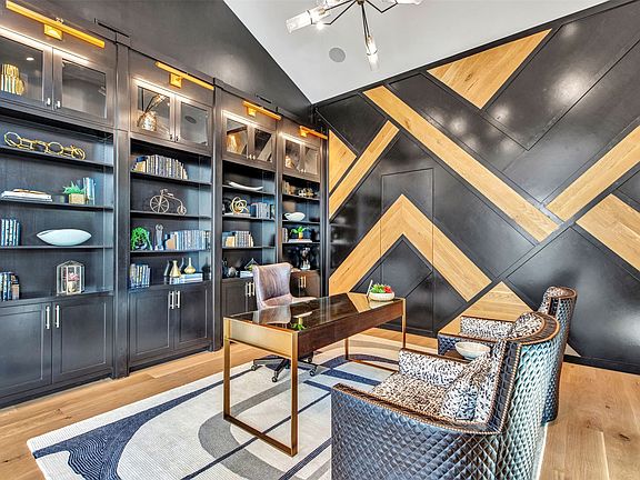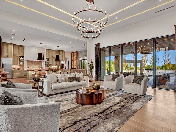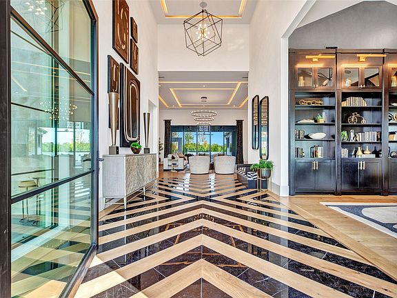 The open-concept kitchen is designed for both form and function, with premium appliances, an additional prep kitchen, and an extended walk-in pantry. Floor-to-ceiling windows in the main living area provide stunning views of the resort-style pool and outdoor entertaining space. The formal dining room features white oak flooring and a striking backlit wine wall, while a soaring 20-foot foyer with black-trimmed glass doors makes a bold first impression.