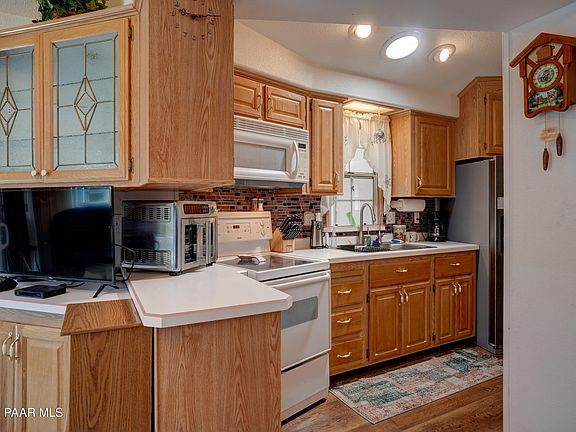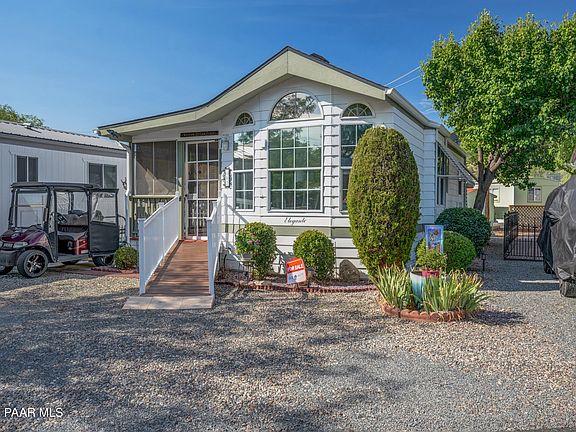 Come see this adorable cottage home just on the outskirts of Prescott Valley. This home has so much to offer. Tons of storage throughout the home, including under the home. There is a nice ample sized shed for storage or work area as well. Windows and sliding glass door are mirror tinted to let in just the right amount of light while also keeping privacy. The washer/dryer are connect inside the extra bedroom inside the house. The screened in porch makes a great space for sitting in the evening. hard surface floors are throughout the home for an upgraded look and easy cleaning, the home also features 2 skylights for additional natural light. Central air and even a soft water system make this home feel just right for a comfortable living.