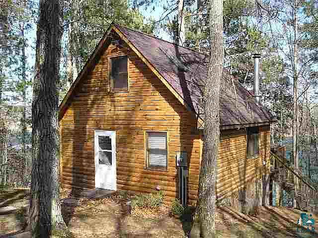 Pretty 1/2 log chalet cabin in totally wooded and very private setting. Rustic up north look with mellow T & G pine interior, hardwood flors, corner stone fireplace with log mantle. Bedroom loft and sitting area. Glass doors open out to wide two level deck facing the lake. Extra high crawl space for storage and utilities. Detached garage for boat and vehicles. Stairway leads to dock and sandy shore. Jump right off the end of the dock into deep swimming hole. Quiet no wake lake.Good fishing.