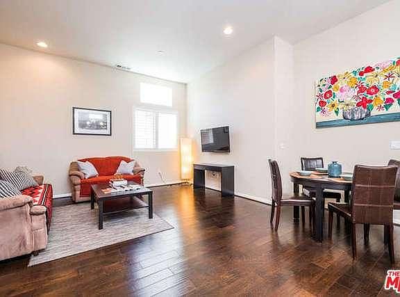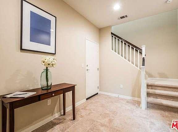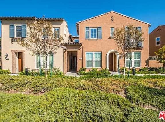 Exquisite Porter Ranch townhouse in the newer Seville at Aldea. This luxurious 2BR offers soaring high ceilings with an open floor plan, elegant wood flooring, upgraded granite countertops, stainless appliances, plantation shutters, a grand master bedroom with walk closet and master bath with separate shower and tub, a spacious second bedroom, and a full second bathroom with shower+tub combo. Also included is a separate laundry with closet and work space. Outdoor space includes a large entryway on lower floor and a beautiful balcony on the upper level. The location and orientation of this unit is highly ideal: two car garage entry is off a wide private road that ends at a cul de sac. Plenty of off street permitted parking and guarded-gated entry. An enviable community area with olympic-sized pool, oversized hot tub, children's splash pool, children's jungle gym, high end bbq grills. Excellent school district in a highly developing community. `This is it. This is home.