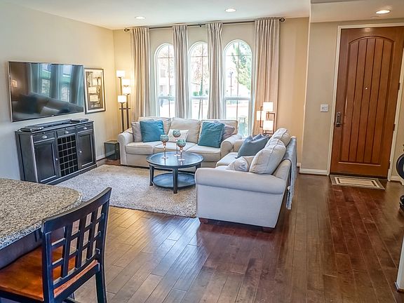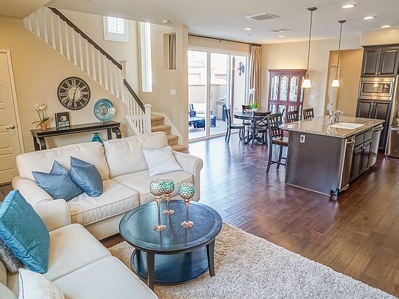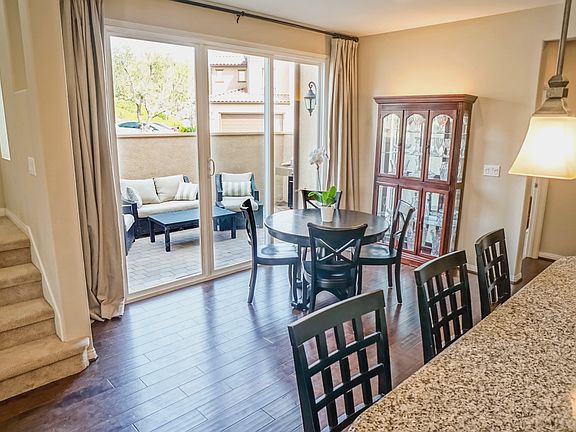 Located in the highly desirable area of Porter Ranch is this stunning Seville home located in the Aldea Community. This 4 bedroom, 3 bath with modern open floor plan features gleaming hardwood floors, recessed lighting, and a spacious Great room with formal dining area. The Gourmet kitchen includes granite counter tops, custom tile backsplash, large island/breakfast bar, upgraded cabinetry, cast iron sink, pendant lights and stainless steel appliances. Ideal floor plan with one bedroom and bath downstairs, perfect for a guest room/ playroom/office. The upstairs master suite features a walk-in closet and upgraded en-suite bathroom that includes double sinks, separate soaking tub and walk-in shower. Two additional spacious bedrooms and laundry room located on upper level. Step outside to your private patio perfect for bbq's and outdoor dining. Other features include: Plantation shutters, Pottery Barn drapes, 2-car attached garage with storage racks, water softener and electric car charging station. The community offers resort-style amenities that include pool & spa, separate children's pool and outdoor BBQ area, playground and security guard. Located within the highly acclaimed Porter Ranch Community School and walking distance to the "The Vineyards" this plaza features Whole Foods Market, restaurants, movie theater, shopping and more. A connecting private gate from this community makes it convenient to walk to this new shopping center. This home was virtually staged.