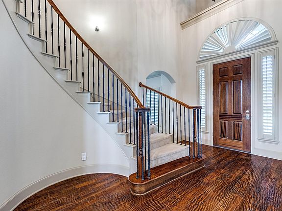 Beautiful traditional home located in the prestigious Shaddock Creek Estates in Frisco ISD. Hand scraped hardwood floors arched entryways and an elegant spiral staircase welcome you.  The spacious kitchen features granite counters, SS double ovens, microwave and dishwasher, rich wood cabinetry, butler's pantry and is plumbed for gas.  It is open to the living area which has a gas fireplace, built ins, 2 story soaring ceilings, Plantation shutters and an abundance of natural light.  A coveted feature is a guest bedroom and full bath on the first level.  The primary suite has a sitting area,