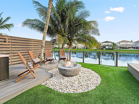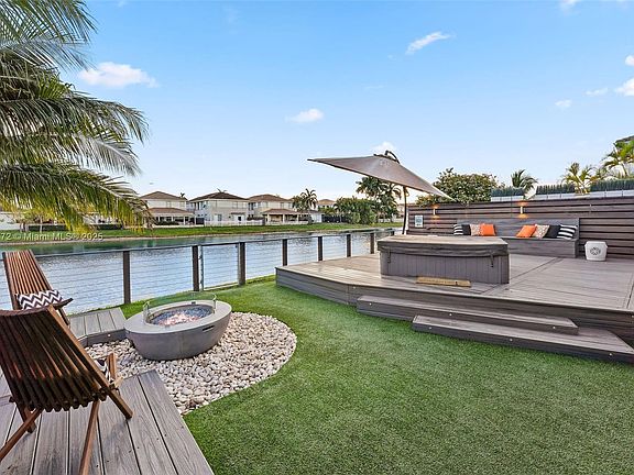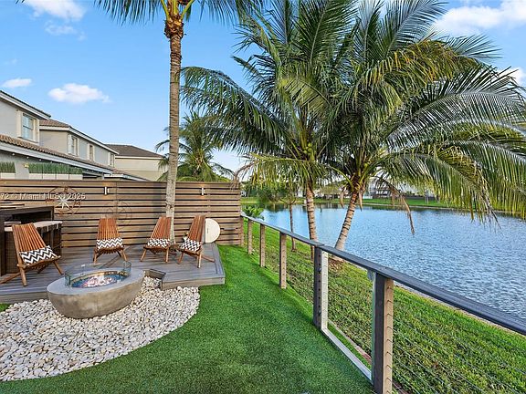 Enjoy gorgeous Miami sunsets lakeside in this beautifully maintained four-bedroom home within the gated community of Biarritz in Doral. Featuring a metal roof with a 50+ year warranty, this stunning lakefront residence offers a thoughtful layout with all bedrooms upstairs for added privacy. The backyard is an entertainer’s dream, showcasing an illuminated elevated deck with jacuzzi, outdoor shower, fire pit, zen garden, and extended covered dining area—perfect for gatherings or peaceful evenings by the water. This backyard oasis is the ideal tropical setting for outdoor grilling and entertaining. Additional highlights include a custom extended three-car paver driveway and low maintenance fee.
