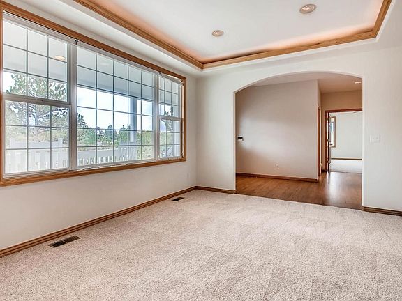 This exquisite custom home sits on a hillside overlooking the town of Parker, Cherry Creek Valley and the mountains beyond. The 2.47 acre lot has abundant trees and is on a paved road. There is new carpet and paint thruout the house. The home lives like a ranch and features 3 bedrooms on the main level and a large 4th bedroom on the 2nd floor. The sun filled Great room is 2 stories with south and west facing walls of windows and opens onto a covered deck. The main floor master has a large bathroom with adjoining walk in closet and has deck access with a large siding door affording wonderful views of the mountains, lights at night and trees. The other 2 main floor bedrooms share a Jack & Jill bath with double sinks. The 2nd floor has a large loft/study in addition to the ample sized bedroom with window seat storage and a 3/4 bath. The oversize 4 car garage is drywalled and insulated with the bonus or back stairway to the basement as well as utility sink with hot