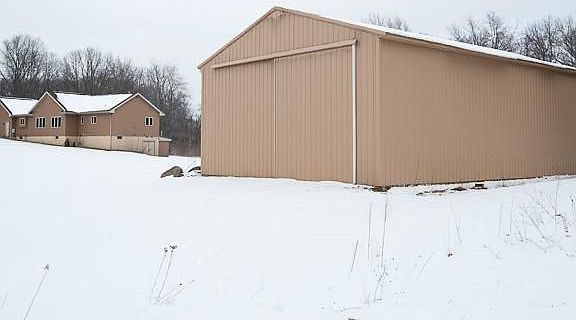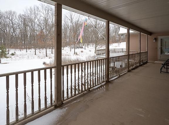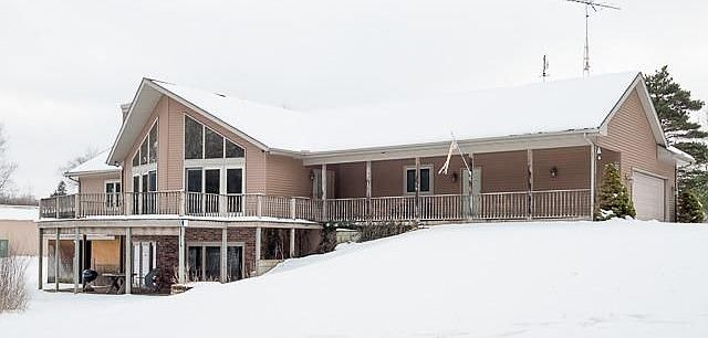 Wonderful setting! 7+ private acres with pond and pole barn. Admire the view from the floor to ceiling windows or the expansive front deck and patio. The main floor features an open kitchen, first floor master with large walk in closet, spare bedroom, dining room, 1.5 baths, sprawling great room with vaulted ceiling, brick gas fireplace and laundry. the walk out basement has lots of light with 6 glass panels, two non-conforming bedrooms (one with a full attached bath), large living area and game area, storage with shelving, cold storage and work room with oversized double door exit. The large pole barn has wood floors, 2 oversized sliding doors, a loft and is insulated. Two heat sources available, propane and Heatmore brand wood burner boiler (new).