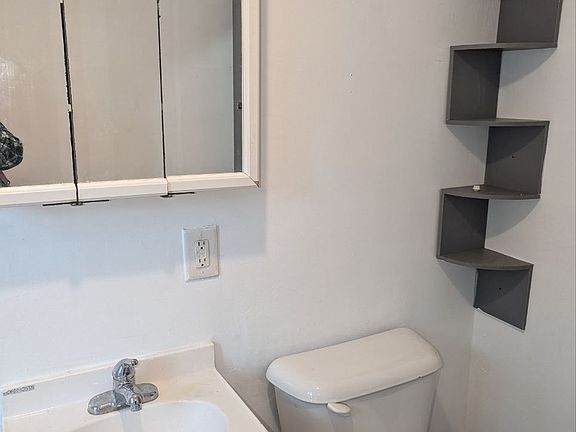 Bright Bathroom: A functional bathroom with a mirrored medicine cabinet for storage, a sleek vanity, and an added corner shelf for easy organization.