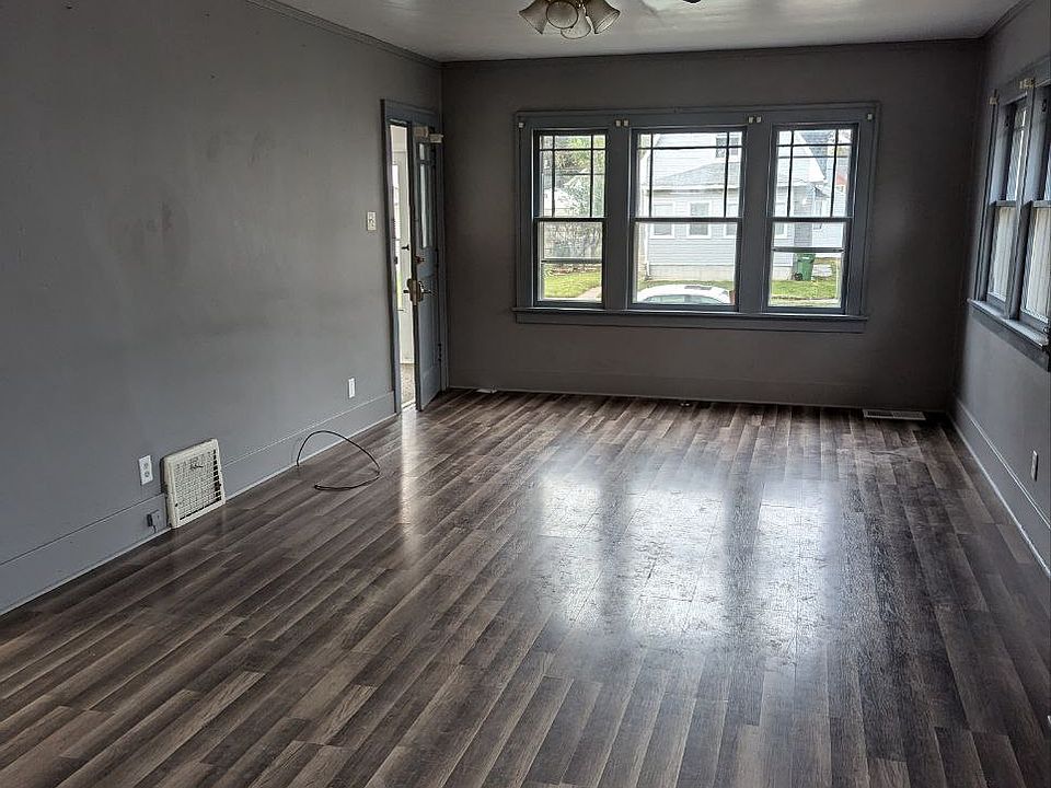 Open Living Room: The living area boasts ample natural light, fresh gray walls, and beautiful wood-look flooring, providing a welcoming space perfect for relaxation or entertaining.