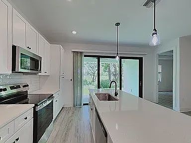 The kitchen features 42" shaker-style cabinets, stainless-steel appliances, and a large island ideal for entertaining. Enjoy luxury vinyl plank flooring throughout, 9'4" ceilings, and plenty of natural light from hurricane-impact windows and sliding glass doors leading to a private lanai.