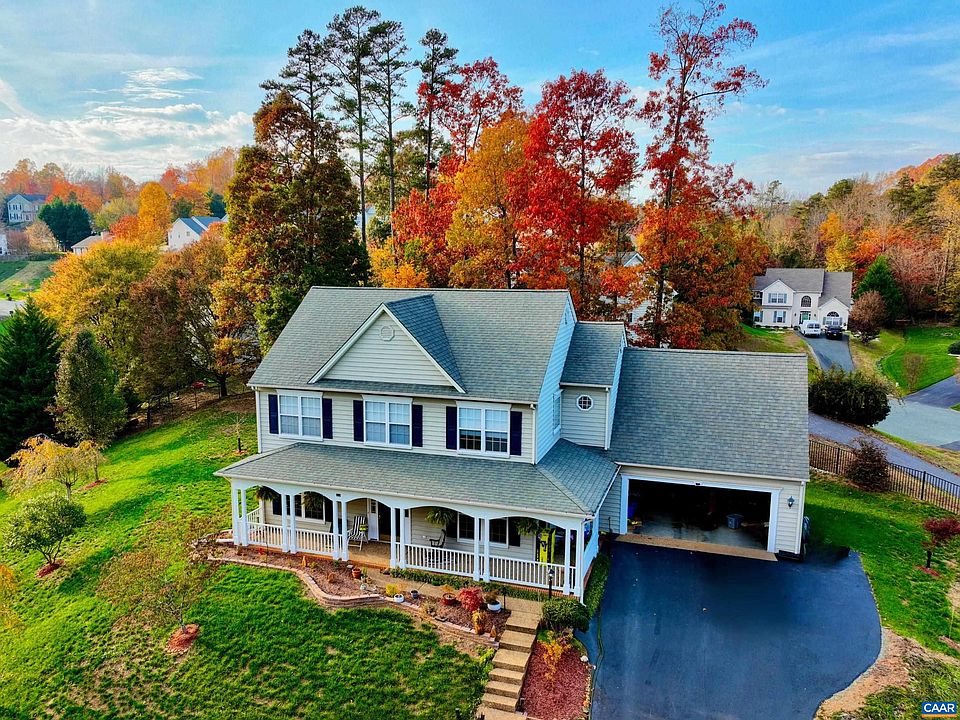 A VIEW FROM THE TOP IN FOXCROFT COMMUNITY! Enjoy the changing of the seasons from your wraparound front porch, as this 4 BR/2.5 BA home is strategically situated on a hill, offering scenic views from the cul-de-sac. Located just minutes from Downtown Cville in the Foxcroft Community, the home boasts a fantastic floor plan featuring an open-concept kitchen, family room, and breakfast area filled with natural light. A cozy gas fireplace adds ambiance to the living space. There are 9-ft ceilings throughout the Main Level, as well as a formal dining room and a large office. The spacious Master Suite on the 2nd level features a vaulted ceiling and includes an oversized bathroom with a separate tub & shower, dual vanity, and a walk-in closet. Enjoy outdoor living on the patio in the private, flat backyard. Recent upgrades include a brand-new electric range (2024), new HVAC system (2022) with a transferable warranty, and newer water heater (2021).