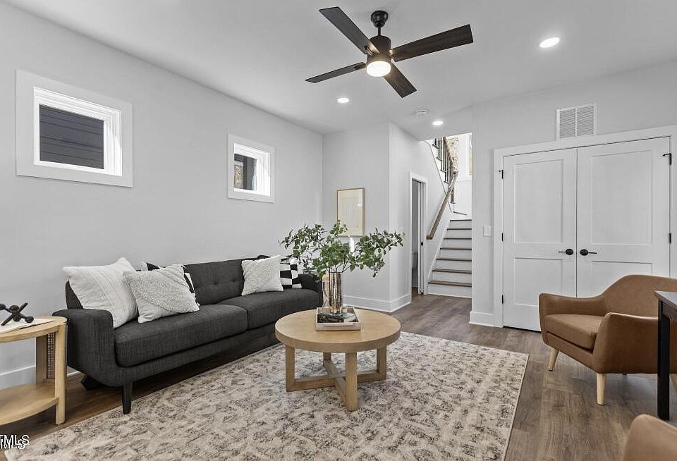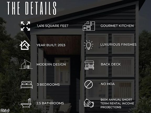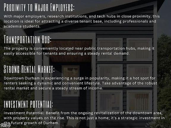 ATTENTION INVESTORS! $60K+ SHORT-TERM RENTAL PROJECTIONS. Contemporary Downtown Durham Property, Minutes to the Vibrant Lifestyle of Downtown Durham, Duke University, RTP, Hospitals and More! NO HOA!!! This property is ideal for homeowners seeking a luxurious urban retreat or a lucrative prospect for savvy investors. Luxurious features include tankless water heater, LVP flooring throughout, contemporary bathrooms, high-end finishes, ceiling fans in all bedrooms, GE stainless appliances, gas range, vent hood, quartz countertops and backsplash, large center island with barstool seating, spacious back deck for grilling, dining, entertainment or relaxation. Minutes to shopping, dining, fitness, cafes, offices, and more.