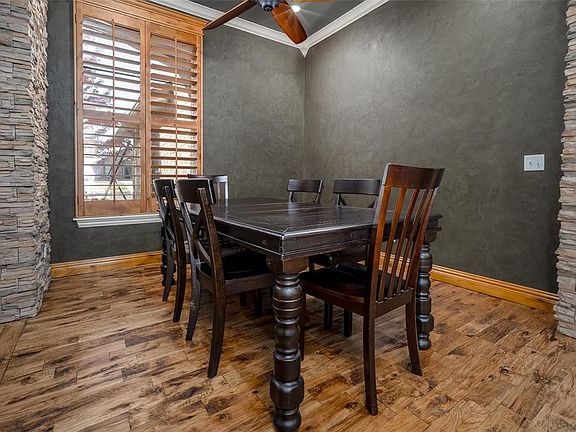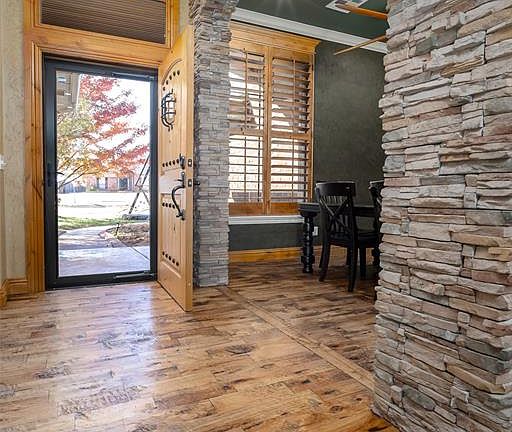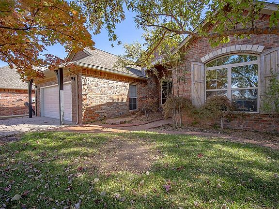 Welcome to this stunning custom-built residence in the sought-after Rock Creek neighborhood of Moore. Nestled along a peaceful waterfront lot with tranquil views of the community fountain, this home offers both refined craftsmanship and casual comfort.