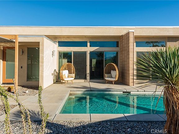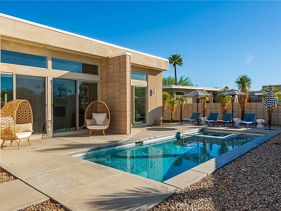 Set on a generous 0.34-acre lot (over 14,800 sq ft), the property offers private outdoor living with pool, spa, and a built-in fire pit, all framed by sweeping views of Mount San Jacinto.