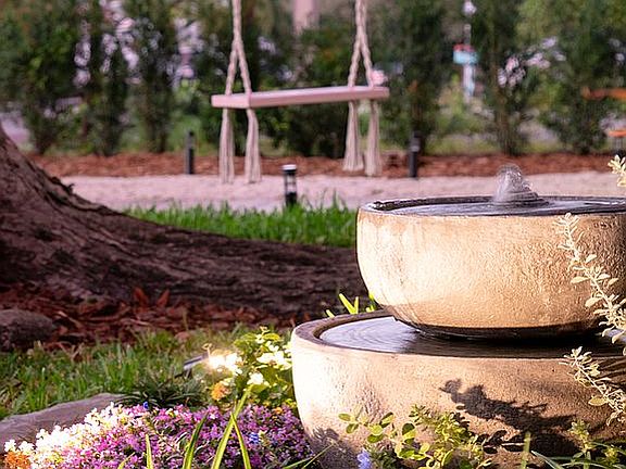Attached garage with laundryLush tropical landscapingWater fountain featureFountain featureJasmine-covered railingGas fire pitRefinished original wood floors