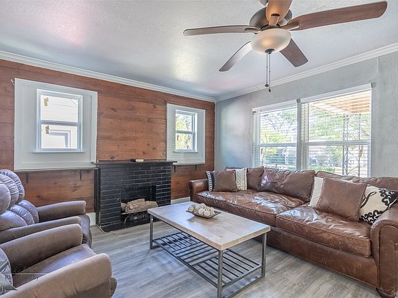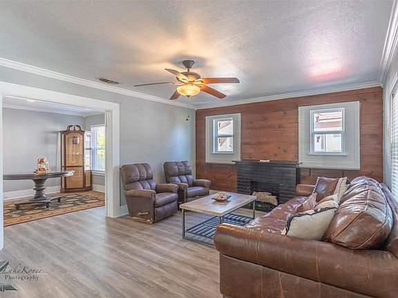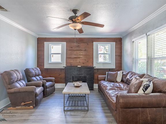 This reimagined Craftsman home rests in the historic heart of Abilene, surrounded by mature shade trees that frame its welcoming charm. Homey details such as accent shutters, new vinyl windows, and a quaint front porch create a timeless first impression. Inside, the early century floor plan showcases purposeful spaces enhanced by fresh paint and new flooring. The spacious living room is anchored by a decorative fireplace, stunning shiplap wood accent wall, leading seamlessly into a light filled dining room adorned with original glass French doors and large accent windows. The kitchen blends modern convenience with preserved character, offering the perfect balance of style and function. Three spacious bedrooms maintain design continuity and share a beautifully updated bathroom with a new vanity and fresh finishes. With thoughtful updates throughout including new HVAC & hot water tank, there are still opportunities to add your own personal touch! This home offers the ideal blend of history, charm, and potential. Your next chapter begins here in the heart of Abilene.