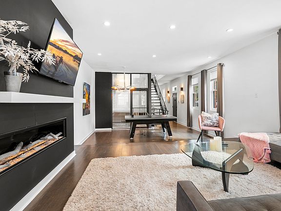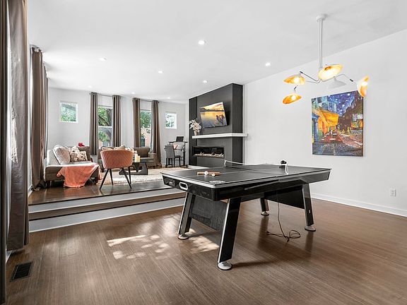 Step inside and you're greeted with a spacious open layout, elevated living area, and tall windows that flood the home with natural light. The sleek LVP flooring and neutral tones set a modern, timeless backdrop. The living room features a stylish fireplace and dual-level design, one area for relaxing with a sofa and television, and a lower space perfect for entertaining.