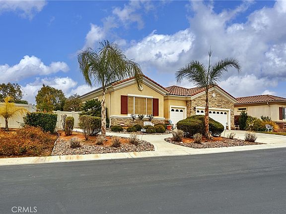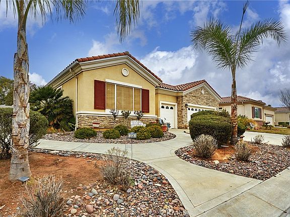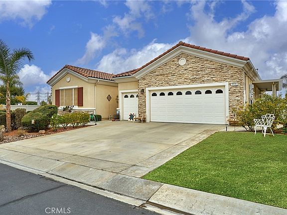 HIGHLY UPGRADED “Emerald” home in the 55+ gated community of Solera. INSIDE: Stained-glass front door entry with security screen door. Gorgeous stained-glass patio French doors leading to a screened permitted SUNROOM. Granite countertops in the kitchen. Custom stained kitchen cabinets with additional pull-out shelves. Stainless steel appliances stay with the home. Built-in 12 ft. buffet in dining room. The REMODELED primary bathroom includes a large built-in storage cabinet, walk-in shower and custom closet. French doors have been added from the master bedroom to the back yard patio. Plantation window shutters throughout. Built-in desks/cabinets and a Murphy bed for your guests in the den/office. Lots of storage in the garage. OUTSIDE: Very private 13,939 SF corner lot. SPA with newer pump. WATERFALL; covered patio; pergola; dog- run on side of the home; 2-yard gates; low maintenance side yard is large enough for a pool. Solar is leased at $170/month. The Solera 55+ community has a pool, spa, clubhouse, indoor gym, indoor walking track, tennis courts, billiards, meeting and banquet rooms, bocce ball, mailroom, library, classes, clubs, group trips and excellent 24-hour security. Basic Spectrum cable and internet are included with your HOA. Solera is close to Palm Springs, Redlands, the scenic mountain town of Oak Glen, Cabazon Outlet Malls, Morongo Casino and the best golf courses around. Solera is also preferred to the other Beaumont 55+ communities because of close, easier freeway access. Beaumont has a small town feel but with access to all there is to see and do in beautiful Southern California.