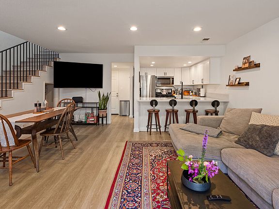 Welcome in to this stunning, modern townhome. This updated 3-bedroom, 2.5-bathroom residence boasts contemporary design and an array of luxurious amenities that truly elevate suburban living. Step into the spacious, light-filled living area with sleek finishes and an open concept layout that seamlessly connects the living room, dining area, and gourmet kitchen. The kitchen features top-of-the-line appliances and ample counter space. Off of the living area one can also find a private patio that's perfect for outdoor living. An attached 2-car garage with updated epoxy flooring can be found on the lower level as well. Upstairs you'll see three generous bedrooms and two full bathrooms. This includes a primary suite with a spa-like ensuite bathroom and large walk-in closet. The other two bedrooms are also very spacious and include elevated ceilings. Additionally, 2 skylights can be found in the unit, which truly maximizes the natural lighting. Beyond the interior, this community offers resort-style living with a sparkling pool, relaxing spa, inviting firepit, 24/7 security, and a charming picnic/playground area, providing the perfect backdrop for family gatherings and leisurely weekends. Don't miss the opportunity to make this townhome your own oasis of contemporary comfort and convenience. Seller will need leaseback until December 15, 2023.