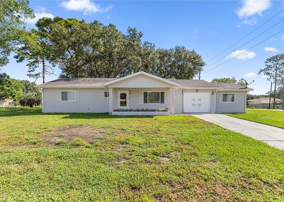 Welcome to your new haven of comfort and serenity in the desirable community of Spruce Creek North, a Deed Restricted 55 and older community. Nestled on a beautifully maintained corner lot adorned with shade trees, this charming 3 bedroom home is well maintained and ready for its new owners! Upon entering the home you will enjoy spacious living and dining area. The well-designed kitchen boasts abundant cabinet space and counter space, ensuring culinary enthusiasts have all they need at their fingertips. This kitchen is larger than most of the homes in this community offer. Both the master and guest bedrooms come with walk-in closets and have room to accommodate a king sized bed. A versatile third bedroom awaits, ready to serve as a home office, den, exercise room, craft room, or mancave adapting to your evolving lifestyle. The 3rd bedroom is located to the right of the home thru the garage, making it accessible from the exterior garage door if you have guests that would like a bit more privacy from the main house. The single-car garage, complete with an opener, provides convenience and sheltered parking. Stepping out to the back, a private oasis awaits you. A covered patio provides the perfect spot for enjoying your morning coffee, grilling, bird watching or hosting intimate gatherings. There is also and enclosed back porch area with vinyl windows that allow you to enjoy the serene views regardless of the weather. Need a bit more storage? A separate storage room ensures your belongings are neatly tucked away. Inside, this haven has been thoughtfully updated. Newer carpet, updated bathrooms and vinyl plank flooring breathe new life into this abode. This is a deed restricted community with a required amenity fee of $111.00 per month. There is no Home Owners Association. This required fee includes a Trash pickup, Clubhouse with library, kitchen and fitness center, a community pool, shuffleboard court and horseshoe pit. The current owner loves that the neighborhood is quiet and friendly. This property is more than just a house; it's a tranquil retreat, whether you're enjoying a leisurely stroll through the peaceful community, relishing in the privacy of your corner lot, or savoring moments on the back patio, this home offers a lifestyle that truly embraces the joys of the 55 and older community.