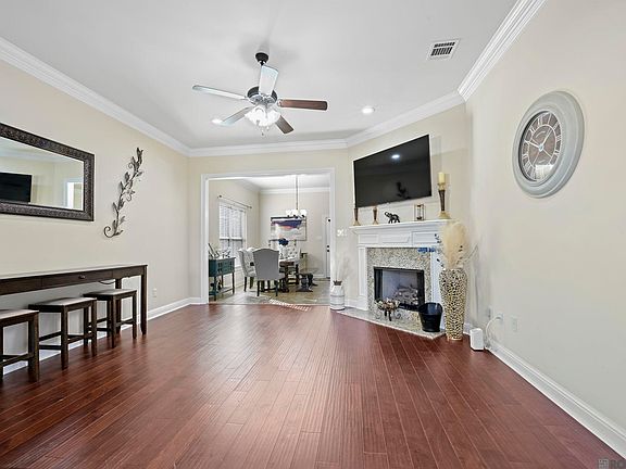 Welcome home to comfort, convenience, and low-maintenance living! This beautifully maintained 3 bedroom, 2 bath home offers the perfect blend of style and function with its open floor plan, wood flooring, crown molding, and cozy ventless gas fireplace. The kitchen is both beautiful and practical, complete with 3cm granite countertops, stainless steel appliances, and a gas range for the home chef. The primary suite features a relaxing soaking tub, separate shower, dual vanities, and a generous walk in closet. Step outside to enjoy an oversized covered patio, ideal for morning coffee or entertaining friends. A fully fenced backyard and 10x20 storage shed add extra convenience. Energy-efficient touches include LED lighting and a tankless water heater. It's conveniently located just minutes from shopping, dining, medical centers and just minutes from the interstate. This home combines modern efficiency with a truly easy living lifestyle.