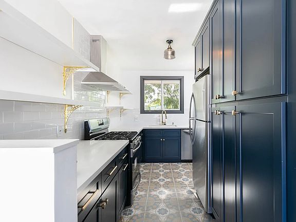 Gorgeous chef's kitchen featuring designer cabinets and hardware, open shelving and full-size stainless steel appliances including a 5-burner gas range.