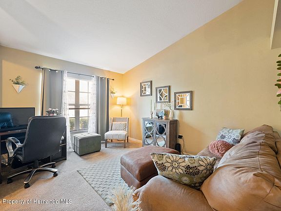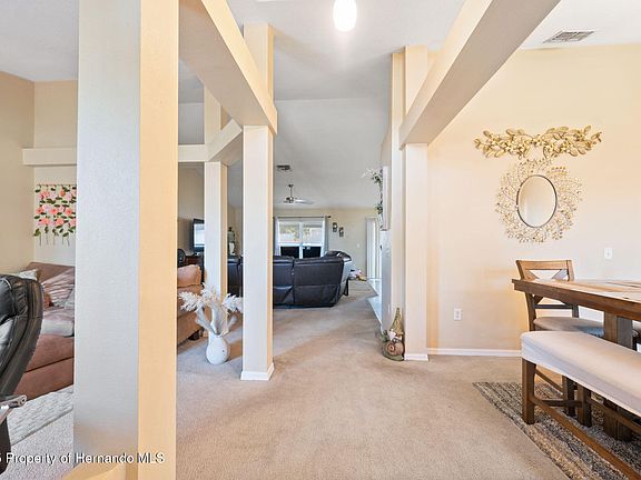 This inviting single-story home with a new HVAC system blends traditional design with thoughtful details, offering 4 bedrooms, 2 bathrooms, and a 2-car garage. A concrete driveway leads to a screened-in garage and arched entryway with decorative columns, setting the tone for the warm interior. Inside, the foyer welcomes you with tall architectural columns that open to a spacious, light-filled floor plan where the dining room, living room, and main gathering space connect seamlessly. The dining area on the right side features a chandelier and breakfast bar, while the main living room is the heart of the home with large windows, sliding glass doors, and recessed lighting, creating the perfect atmosphere for both entertaining and relaxing. The kitchen offers timeless functionality with wood cabinetry, stainless steel appliances, decorative shelving, and a breakfast bar for casual dining, complemented by the adjacent breakfast nook overlooking the sunroom. The primary suite on the left side is a retreat of its own with multiple windows, a walk-in closet, and an en suite bath featuring double vanities, a soaking tub with tiled surround, and a separate glass-enclosed shower. The second bathroom is equally well-appointed with a wide vanity, natural wood cabinetry, framed mirror with lighting, decorative shelving, and a tub-shower combo illuminated by natural light. The additional bedrooms provide versatility with walk-in closets, ceiling fans, and layouts that adapt to family needs, guest accommodations, or office space. Expansive sliding doors lead to the screened-in sun room, a true extension of the living space where durable concrete flooring, a flat finished ceiling, and full-height screened panels create a comfortable space for year-round enjoyment—ideal for exercise equipment, outdoor dining, or simply relaxing with a view of the fenced backyard. Outside, mature trees and open grassy areas provide privacy and shade, while a storage shed adds convenience for tools or lawn equipment, and there's ample room for gardening, play, or even the addition of a pool. The home's location offers both tranquility and accessibility, just 6 miles from the Suncoast Expressway, making commutes to Tampa and surrounding areas simple and efficient. Local attractions include Weeki Wachee Springs State Park (8 miles), famous for its crystal-clear waters, kayaking, and manatee sightings; Hernando Beach (12 miles), a scenic gateway to the Gulf of Mexico with boating and fresh seafood dining; and The Nature Coast Botanical Gardens (5 miles), where walking paths and themed gardens create a serene retreat. With a blend of comfort, space, and convenience, this home is designed to support both everyday living and memorable moments, making it a place you'll love coming home to.