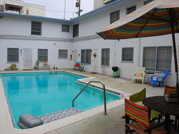Nice and bright 2-level 2 bed/1 bath townhouse-style unit in a small building with pool and on-site laundry. Laminate wood flooring, window coverings, kitchen comes with a stove and refrigerator. good closet space. Pool, on-site laundry. Street parking only (a 1 car garage can be rented separately for $300 mo).
