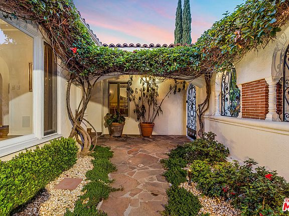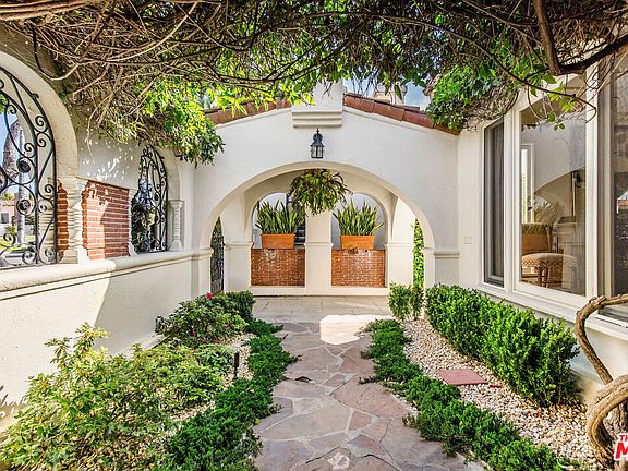History points to the future and provides an opportunity to procure a quintessential Spanish Colonial Revival home. The fine craftsmanship of 1934 is redolent in this meticulously restored property, blending historic charm and modern luxury. Tucked away in South Carthay, a Historic Preservation Zone, it also has Mills Act Tax status and recognition on the National Register of Historic Places. Original architectural details, including intricate wrought iron work, scalloped archways, a reinforced stained glass window, faux bois doors and millwork, intricate plaster detailing, and Paul Ferrante light fixtures, are seamlessly integrated with contemporary amenities for comfortable living. An elegant living area features a grand fireplace, casement windows, and beamed ceilings, creating a true sense of place. Formal dining room with courtyard view leads to a kitchen that exudes classic elegance with very generous Walker & Zanger Indian raked black granite countertops. A Waterworks tiled backsplash, Anne Sacks flooring, Viking professional grade 6-burner stove, and a charming breakfast nook with highly detailed breakfront make the perfect space for culinary enthusiasts and curious dinner guests. The expansive primary bedroom has a thoughtfully renovated private bath with a separate tub, shower, and a secluded water closet. A French door opens to a covered porch overlooking an antique brick entertaining space. Intimate enough for morning coffee or dinner for two, this area would seat dozens as your backyard becomes a cherished venue. There is ample home working space and a convertible guest space with a vintage tile bath and wet bar. Located near the Miracle Mile, West Side, Beverly Hills, and Culver City cultural amenities, this residence offers a rare opportunity to leave the fray and experience a classic lifestyle in the heart of Los Angeles.