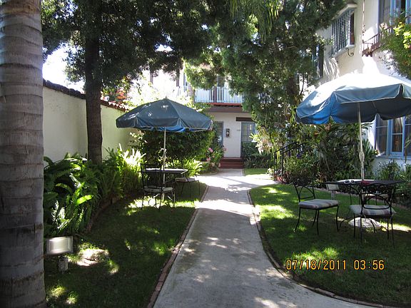 1920's courtyard, controlled access building, behind gates on a cul-de-sac, features lush landscaping and a four-tier fountain, which makes for lovely, tranquil and serene surroundings. Completely restored building is very private and peaceful. This spacious apartment features hardwood floors, antique light fixtures and two-tone custom paint throughout. The living room has wood beamed ceilings and French Doors, which ensures a lot of natural light. The kitchen includes a refrigerator, antique stove, dishwasher and garbage disposal as well as original art deco tile. Romeo & Juliet balconies off the kitchen and bedroom The bedrooms are large and have ample closet space. The bathroom is a combination bathtub/shower. a/c, Parking garage included, laundry on premises. Walk to Everything. Rare opportunity. Best of all, we welcome your pets Eileen - 310-499-3495 or Marc Pakin - 818-445-4521
