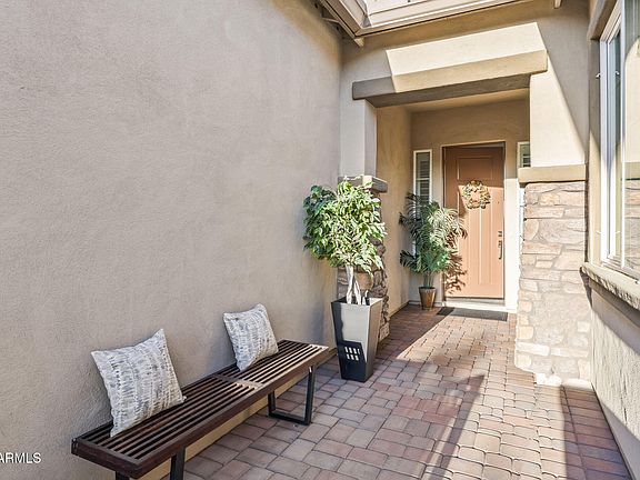 Do not miss this well-appointed open concept gem of a property in the sought after Groves at Valencia gated community! Upon arrival you'll be greeted by lovely curb appeal, charming front porch, paver driveway, & private courtyard. Step inside & be taken aback by clean sightlines, soaring ceilings, gorgeous finishings throughout, & the true seamless AZ indoor outdoor lifestyle this meticulously maintained home affords. Kitchen is a chefs dream with oversized island, sleek quartz counters, shaker cabinetry, gas cooktop, SS appliances, & walk-in pantry. Great room walks directly outside through expansive sliders to covered patio & resort style backyard boasting sparkling pool and spa, built-in BBQ, crisp travertine, pergola, & appealing landscaping. Spacious primary bedroom offers luxurious ensuite with rain drop shower, dual vanities, & walk-in closet. Practical floorplan with flex bedroom/office space & large laundry room off kitchen. Bonuses include 3 car garage, Indow window inserts for peace & quiet, as well as resealed ductwork & added insulation for energy efficiency. Great location with canal & walking/biking path directly behind home, mountain views, hiking, golf, restaurants & shopping just minutes away.