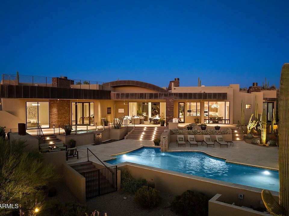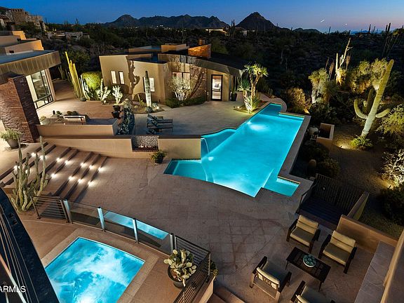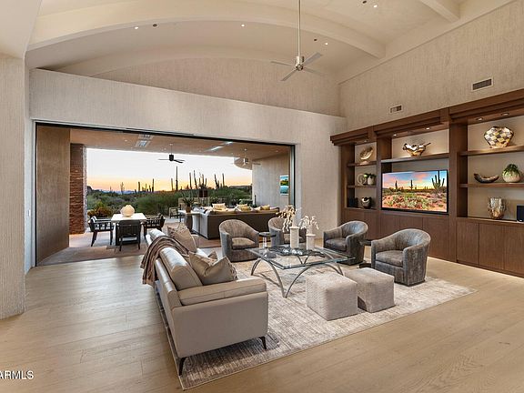 A private desert sanctuary just minutes from North Scottsdale's premier dining, shopping, golf, and hiking, this 8,000+ sq ft estate on 3.6 acres in gated Sonoran Reserve exudes luxury and effortless style. Recently updated with new wood flooring throughout, a refreshed kitchen, and freshly painted custom-textured walls. Featuring four ensuite bedrooms in the main house and a 1,096 sq ft guest house with living area and two baths. Expansive patios, a sparkling pool, and an elevated deck create perfect spaces for entertaining, all overlooking sweeping 360° desert vistas where each sunset feels like a private masterpiece. If you're looking for complete privacy with stunning desert views and picturesque sunsets you have found your dream home. Designed by Award winning architect Marc Soloway.
