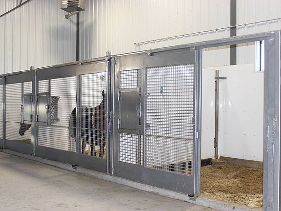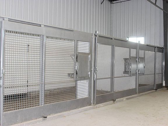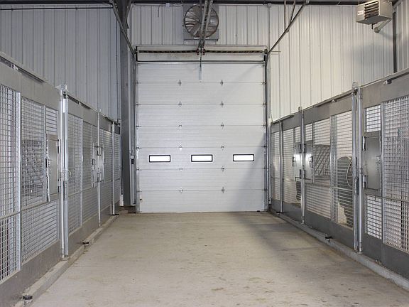 80' x 62' equestrian building featuring a heated and ventilated barn with exhaust fans. The north side offers six 12' x 12' stalls (three per side of a concrete alley), with the option to convert two stalls into 12' x 24' for a larger area. The south side includes two 12' x 18' foaling stalls. Automatic waters with freeze-protected interior lines. Heated and air-conditioned vet room, tack room with rotating saddle rack wall, wash bay with drain to septic and leach field, hay and feed area, 1/2 bath, two heat pumps, and on-demand water heater. Large overhead doors for easy access. Upstairs loft offers flexible use as living quarters, office, or entertaining space, featuring an open-concept layout with fireplace, full kitchen with island, and 3/4 bathroom. South side of the building includes a full-frame expandable end wall for future addition. Property also features four pasture paddocks and two separate feeding areas with timed lighting. Very nice, well-designed setup!