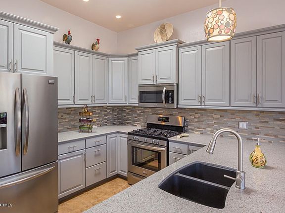 Beautiful remodeled kitchen! Design is very upscale, w/stainless steel appliances, gorgeous cabinets, backsplash and granite countertops. 20'' tile throughout except bedrooms which have newer carpet. Rear yard faces East, W no homes behind. Lovely Fireplace in great room & space for big screen TV. Owners bath has separate shower & soaking tub. Beautiful designer paint colors throughout. New 14 seer Lennox HVAC. Lots of pride of ownership!