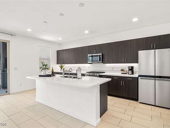 Stylish townhome in the heart of Summerlin. Welcome to this modern 3 bedroom, 2.5 bath townhome located in the highly sought after Affinity Community, just minutes from Shopping in Downtown Summerlin, Red Rock, fabulous dining and freeways. Step inside to discover designer finishes throughout, including custom Crate & Barrell Wallpaper, custom features in the pantry, and a Honeywell Smart thermostat for modern comfort. The kitchen features an oversized island opening to the great room-ideal for entertaining-along with a walk-in pantry, high-end 3 zone refrigerator, stainless steel appliances. Enjoy the balcony just off the great room. The primary bedroom has a private balcony and a barn door for privacy. Additional highlights include a 2 car garage with high end metal storage cabinets. This gated community offers pools, spa, fitness center and recreation activities.This townhome blends style, convenience, and community living, a true gem in Affinity.