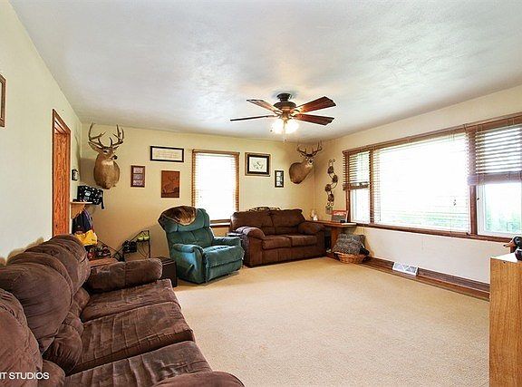Breathtaking Views for Miles - from this 5 acre farmette! Home offers 3 or 4 bedrooms, 2 full baths, newer kitchen with Hickory cabinets, cathedral ceiling over table area, patio doors to deck. Laundry/mud room on main floor, enclosed porch, full basement. Hardwood flooring. New windows, 200 amp & circuit breakers new, some plumbing. 45x90 metal shed with work shop, part concrete part gravel. 2 small pastures. approx 2 acres tillable. Plenty of space of a garden. Enjoy the evening sunsets from the deck overlooking miles of farmland. Come take a look.