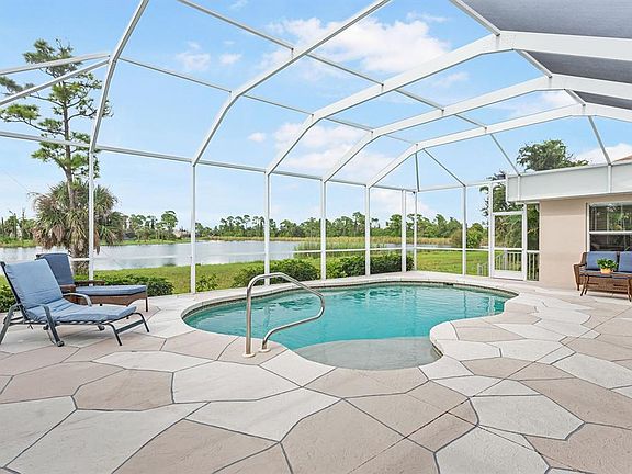 STUNNING LAKE VIEW from this elegant, ELEVATED and impeccably maintained home in Rotonda West. INSIDE, a large tiled entry opens to a spacious living room w/cathedral ceiling, diagonal tiled flooring throughout & 8’ pocket sliding glass doors leading to the lanai. A large front dining room with picture window provides the perfect place for meals with convenient access to the AMPLE-SIZED KITCHEN. Featuring an island, breakfast bar, built-in desk, 42” raised face cabinetry w/ granite countertops, pantry & newer stainless-steel appliances – this kitchen provides everything you need for in home storage, organization and entertaining! A picture-perfect dinette provides the perfect view for coffee through an aquarium window. The OVER-SIZED PRIMARY SUITE is a true retreat with a vaulted ceiling, large walk-in closet, French doors to the lanai and an ensuite bath with double vanities, garden tub, walk-in shower & linen closet. Tucked on the opposite side of the home, both guest bedrooms are neutral and bright with built-in closets. The guest bathroom with large vanity and tub/shower combo doubles as a POOL BATH with quick access to the lanai. OUTSIDE, you will fall in love with the LONG-RANGE WATER VIEW BACKDROP and oversized lanai – perfect for soaking in sunset views and wildlife from your ELEVATED and HEATED POOL (Pool built 2010 / 2023 Heater.) Featuring an elegant concrete stamped deck for easy maintenance, 2023 ALUMINUM SCREENED ENCLOSURE and plenty of space for outdoor living – this home offers a tranquil sanctuary from the outside world. ADDITIONAL FEATURES to note here include the large indoor laundry room, 2020 installed recycled irrigation system, 2022 ROOF, 2025 HVAC SYSTEM and Manabloc PEX plumbing system! Located in the highly sought-after community of Rotonda West, this home provides an aesthetically pleasing neighborhood with low fees and convenient access to five nearby golf courses, a central park with playground, tennis courts, RV/boat storage, and is just minutes away from the beautiful beaches of Boca Grande and Manasota Key. Schedule your showing today to experience the quality Florida lifestyle this property offers!