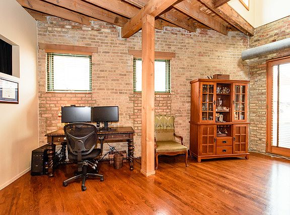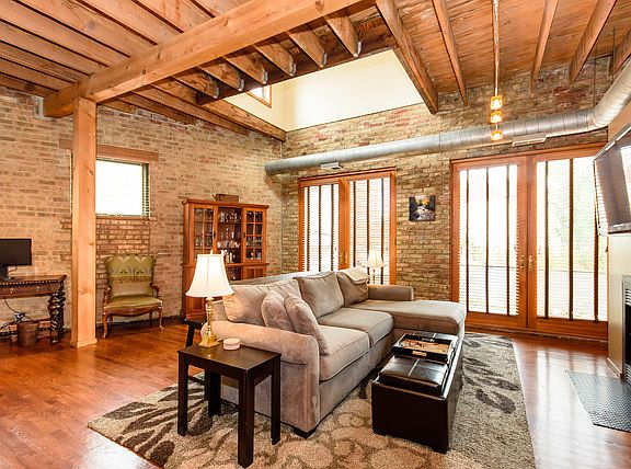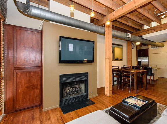 View our virtual 3D tour! Wrigleyville Timber Loft condo with roof deck and deck off living room! 8 Minute walk from either Red Line or Brown Line. Exposed brick and spiral duct work throughout. Hardwood floors, high ceilings, great space, updated open kitchen w/breakfast bar, private deck off living room, wood burning fireplace, roof top deck off 2nd bedroom with private bathroom. Top floor unit only one flight up. Private Garage parking! Quiet block with everything out your door!