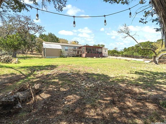 Tucked away on almost one and a half acres, this single wide manufactured home is loaded with great features for country living in the hills. The land has a wooded perimeter providing separation from the outside world. Lots of outdoor living space here. The screened-in front deck leads to the front entry, a cedar branch pergola and convenient storage building, a large front yard with plenty of room for a garden, and a back yard that is more natural. Many mature trees create shade for gatherings and for watching the deer stroll by. Nighttime brings a big starry sky to get lost in. Inside you'll step into an entry with built-in storage and display cabinets. The split floor plan has 2 bedrooms and a bath on one end with a primary suite on the other. Primary ensuite bath comes with garden tub, dual vanities, step-in shower, and walk-in closet. The kitchen has lots of storage and, off the kitchen, the laundry room doubles as a mud room with the back door opening to the 3-car carport and workshop. Lake Medina Shores provides lake access, 3 river parks (Be sure to check out the "Pecan Bottom" river park in the photos), a neighborhood pool, volleyball courts, picnic areas, and more. All of this and only 15 minutes from the City of Bandera, 45 minutes from Helotes, Boerne, Hondo, and about an hour from San Antonio or Kerrville. Fresh air, hills, and starry nights. Yeehaw!!!!